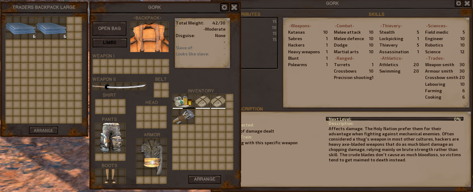 MOD概要 このMODは、Kenshiに新しいカスタムスタートシナリオを追加します。プレイヤーは放浪の鍛冶師として、過去の徒弟期間を終え、新しい人生を始める設定でゲームを開始します。 このMODで何が変わるか – **開始シナリオの変更**: プレイヤーは「放浪の鍛冶師」としてゲームを開始します。 – **キャラクターの背景**: 長年の徒弟期間を終えさせても