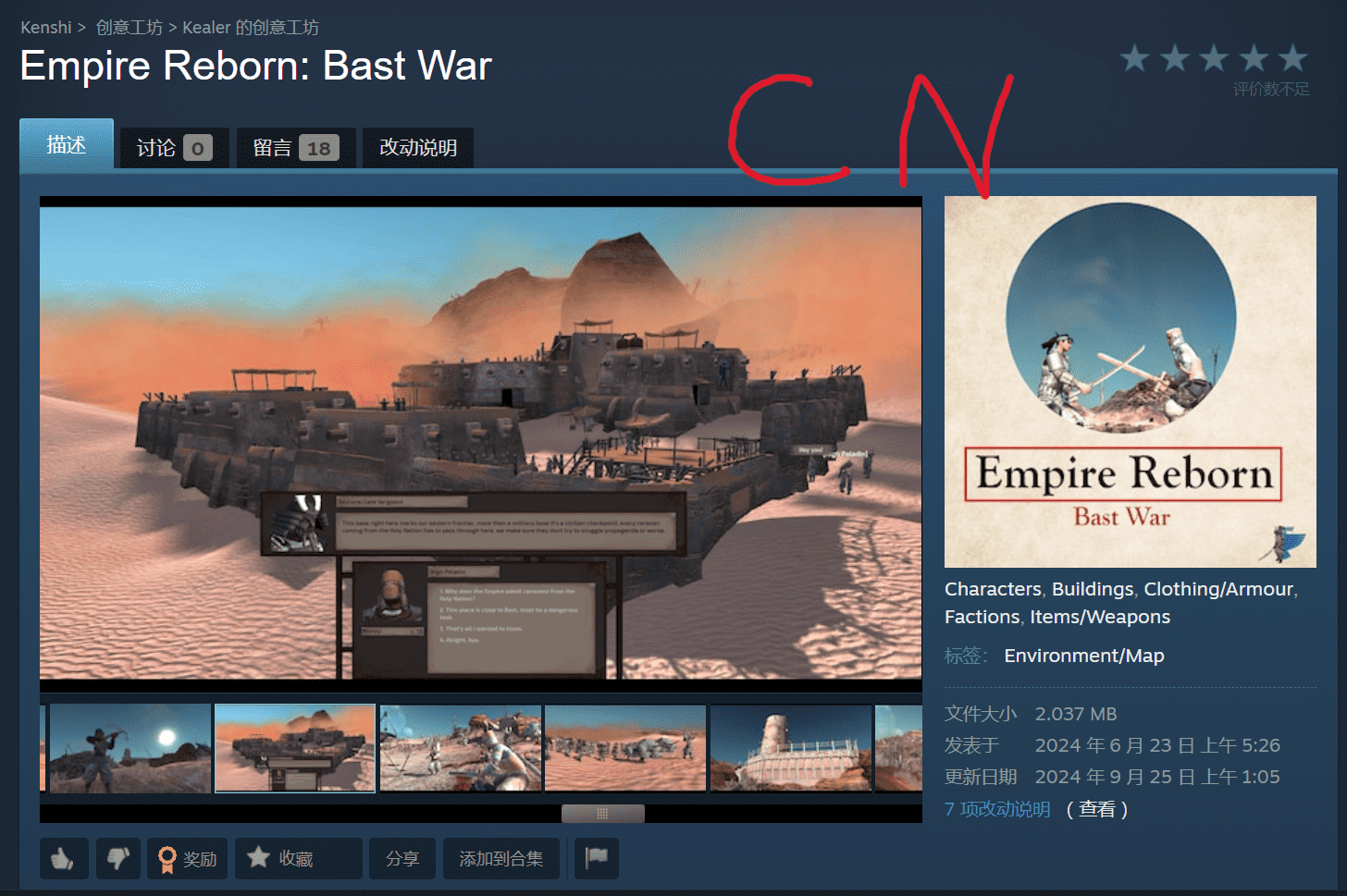 MOD概要 これは「帝国重生(Empire Reborn)」MODのオプションアドオンです。このMODが動作するためには、「帝国重生」MODと、説明文下部にリストされている必須MODが必要です。Kenshiの「バスト」地域を対象としており、新しいロケーション、世界国家、キャラクター、会話、キャンプ、および小隊を追加・改造することで、バスト地域の戦場としての深度を強化します。また、